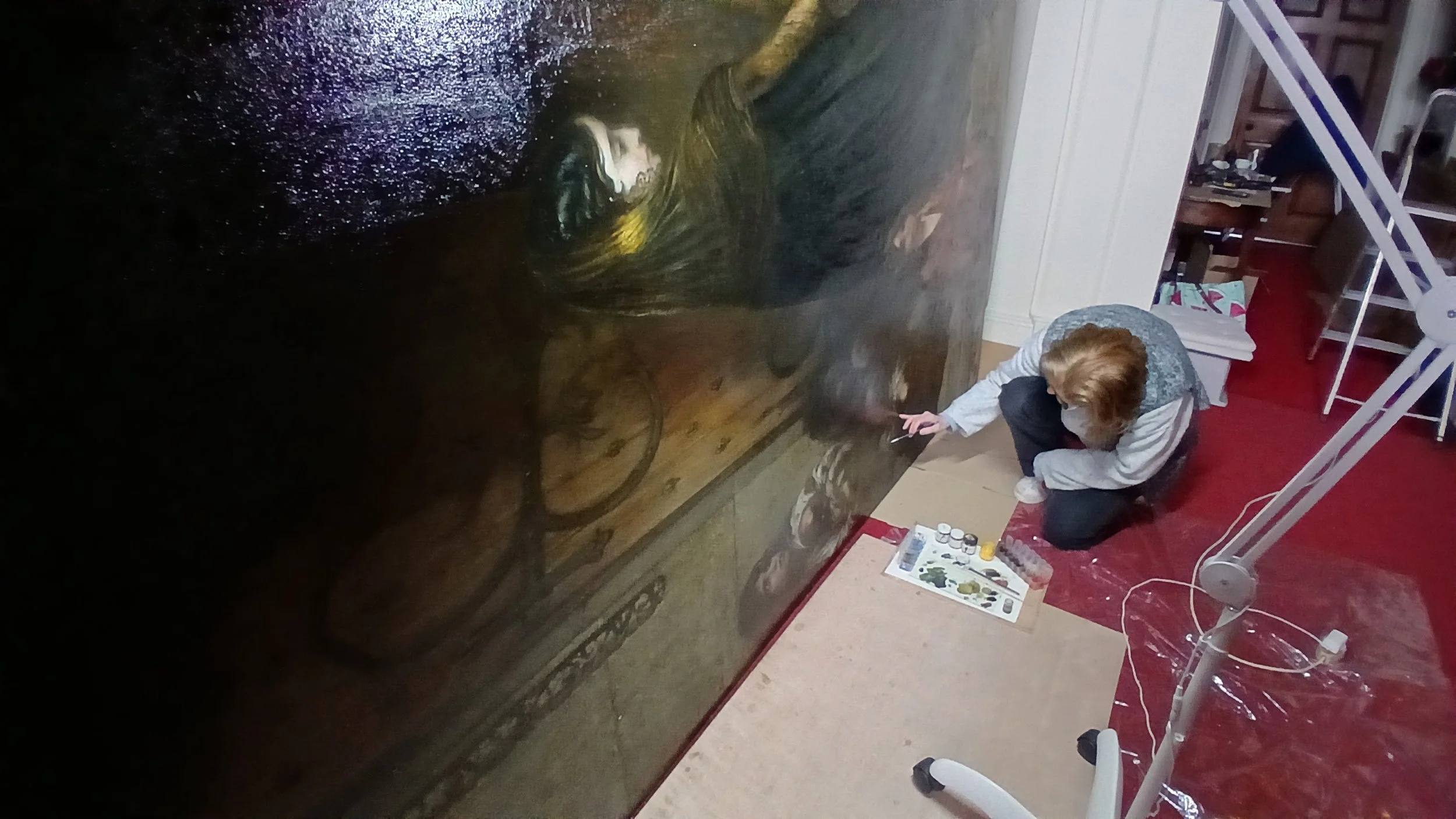 Fine Art Conservator, Vanessa Andrews, at work on Blessed are the Charitable by Gustave Doré’